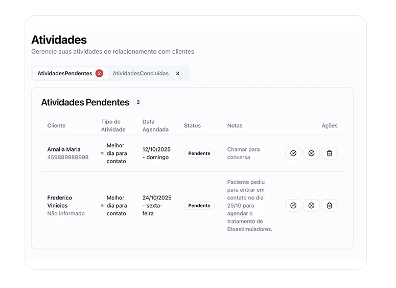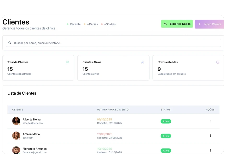 Visualize rapidamente o tempo desde o último procedimento dos seus clientes e contate os inativos com facilidade: ● Verde para atendimentos recentes, ● Laranja para atendimentos há mais de 15 dias, e ● Vermelho para atendimentos há mais de 30 dias.