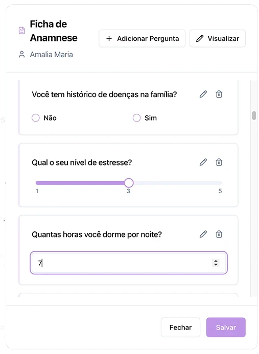 Sim! A ficha de anamnese é interativa e totalmente personalizável: adicione ou remova perguntas a qualquer momento, tornando o processo ágil e adaptado às suas necessidades específicas.