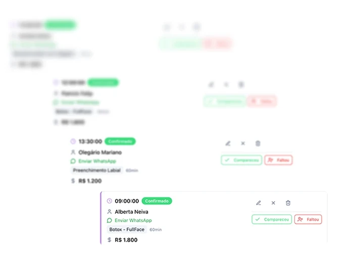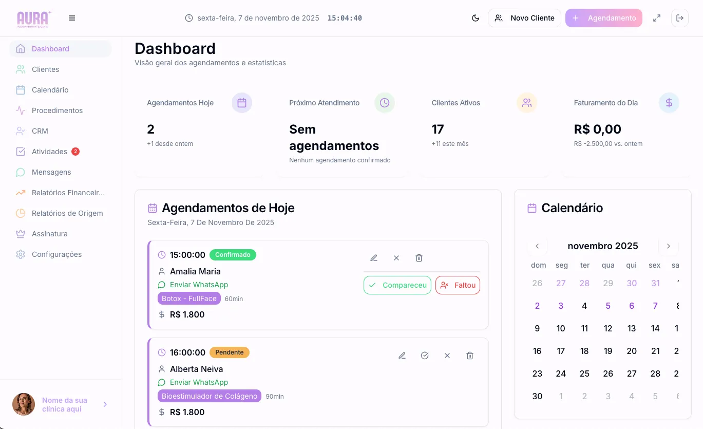Com a Aura, você visualiza agendamentos em tempo real na agenda facilitada, envia confirmações via WhatsApp e altera horários com um clique. É ideal para evitar erros e otimizar sua rotina diária.