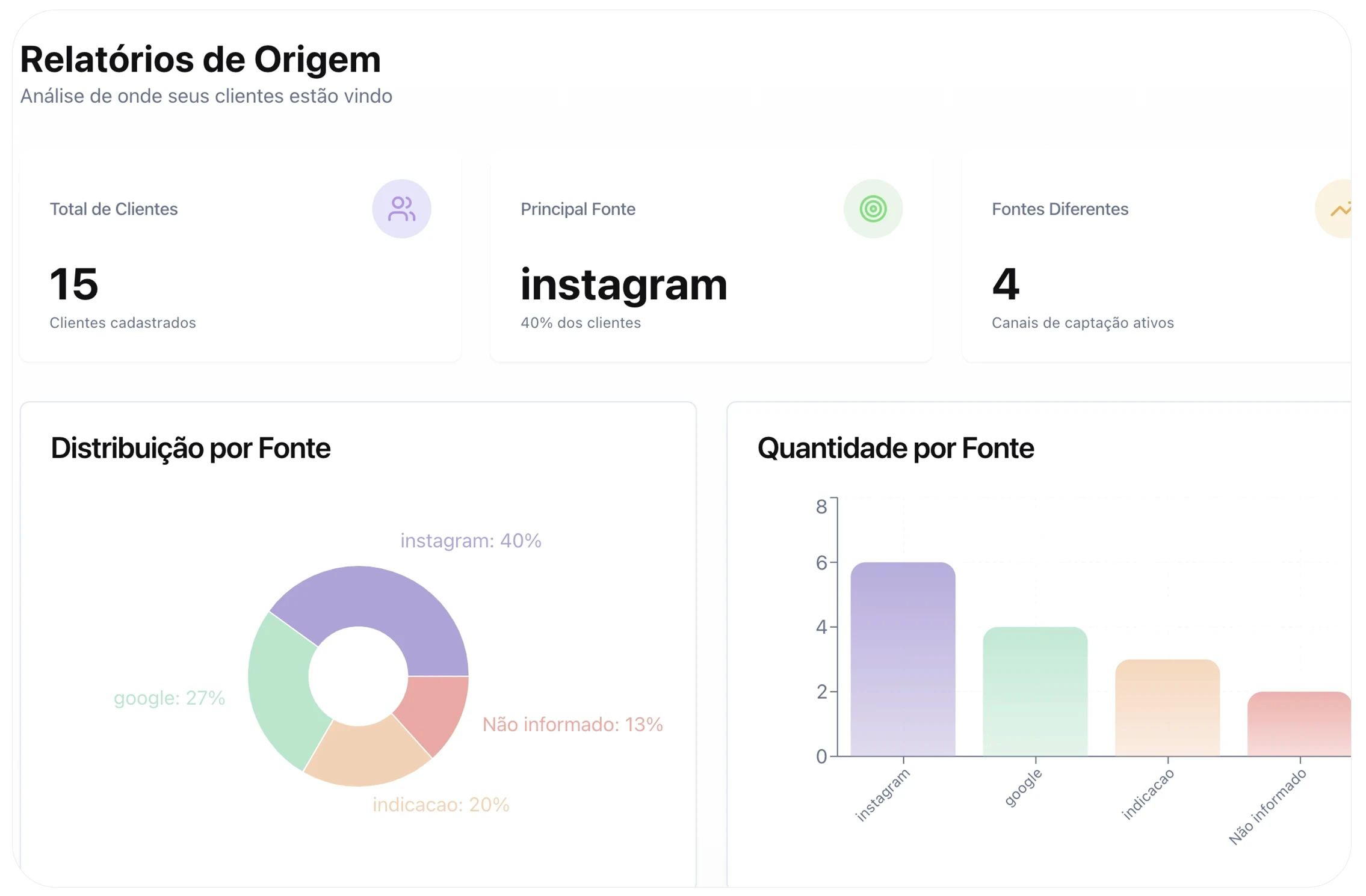Acompanhe em tempo real a origem dos seus clientes, identificando se vieram por indicação, Google, Instagram ou outras fontes, de forma simples e organizada, com dicas para aumentar cada vez mais seus agendamentos.